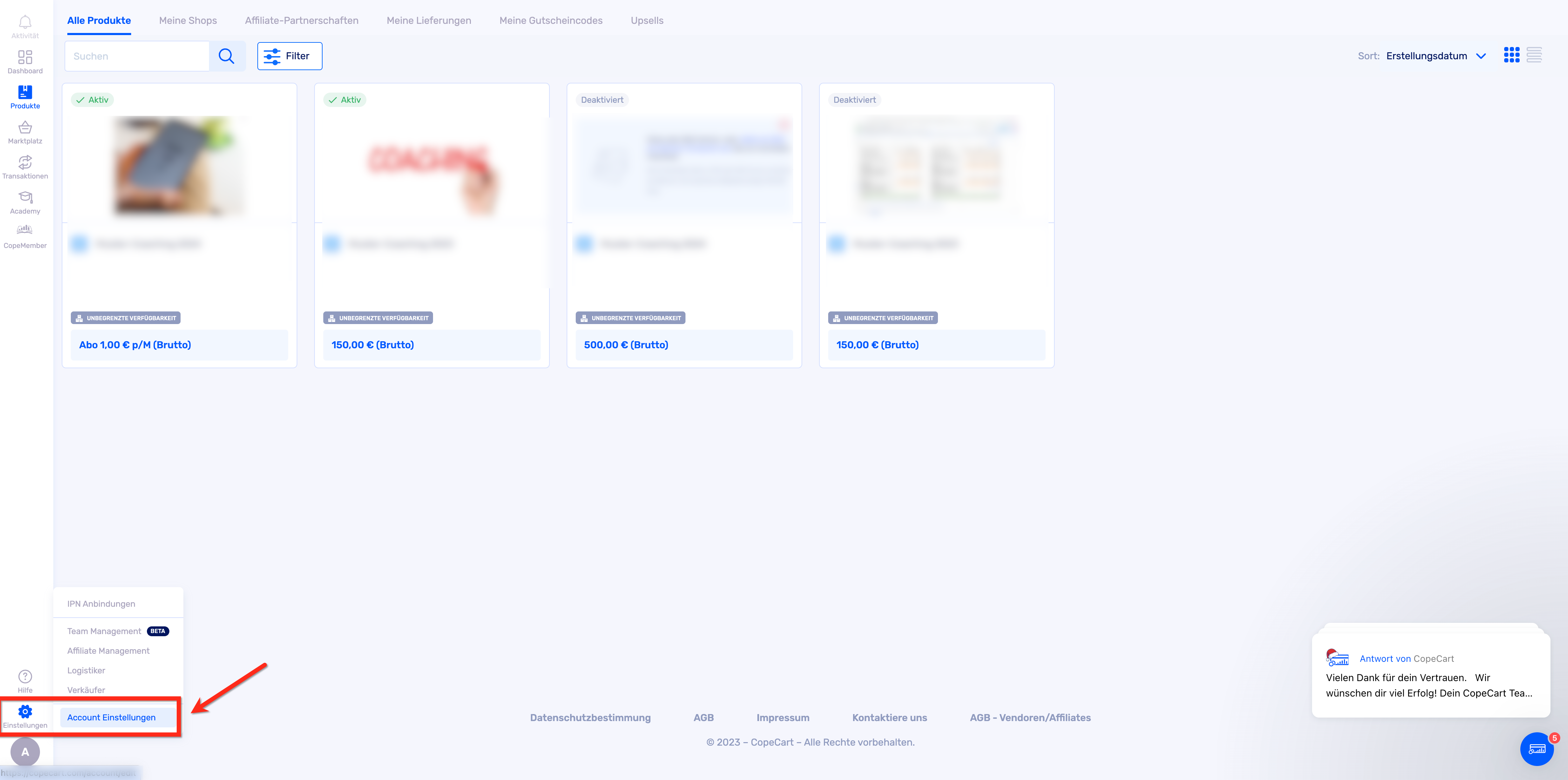 Folge einfach den nachstehenden Schritten, um die E-Mail-Adresse in deinem CopeCart-Account zu aktualisieren.