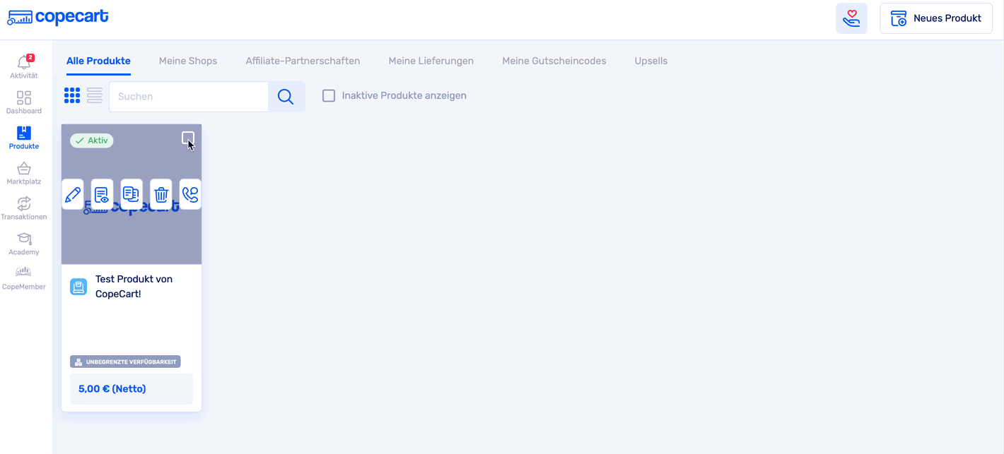 Melde dich zuerst bei deinem CopeCart-Konto an und wähle das Produkt aus, das du für die Erstellung eines Affiliate-Links verwenden möchtest. Wähle oben rechts den Button und kopiere die URL.