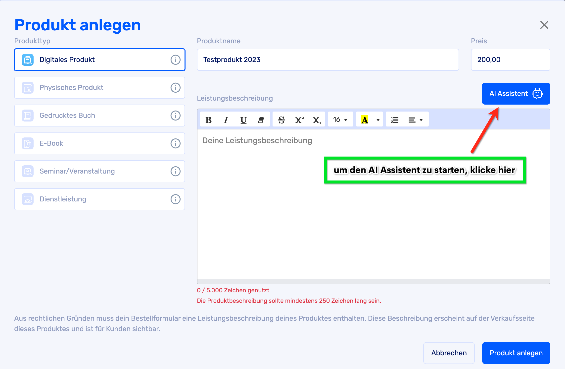 CopeCart stellt dir AI als feature zur Verfügung, um die Erstellung deines Produkttextes zu automatisieren