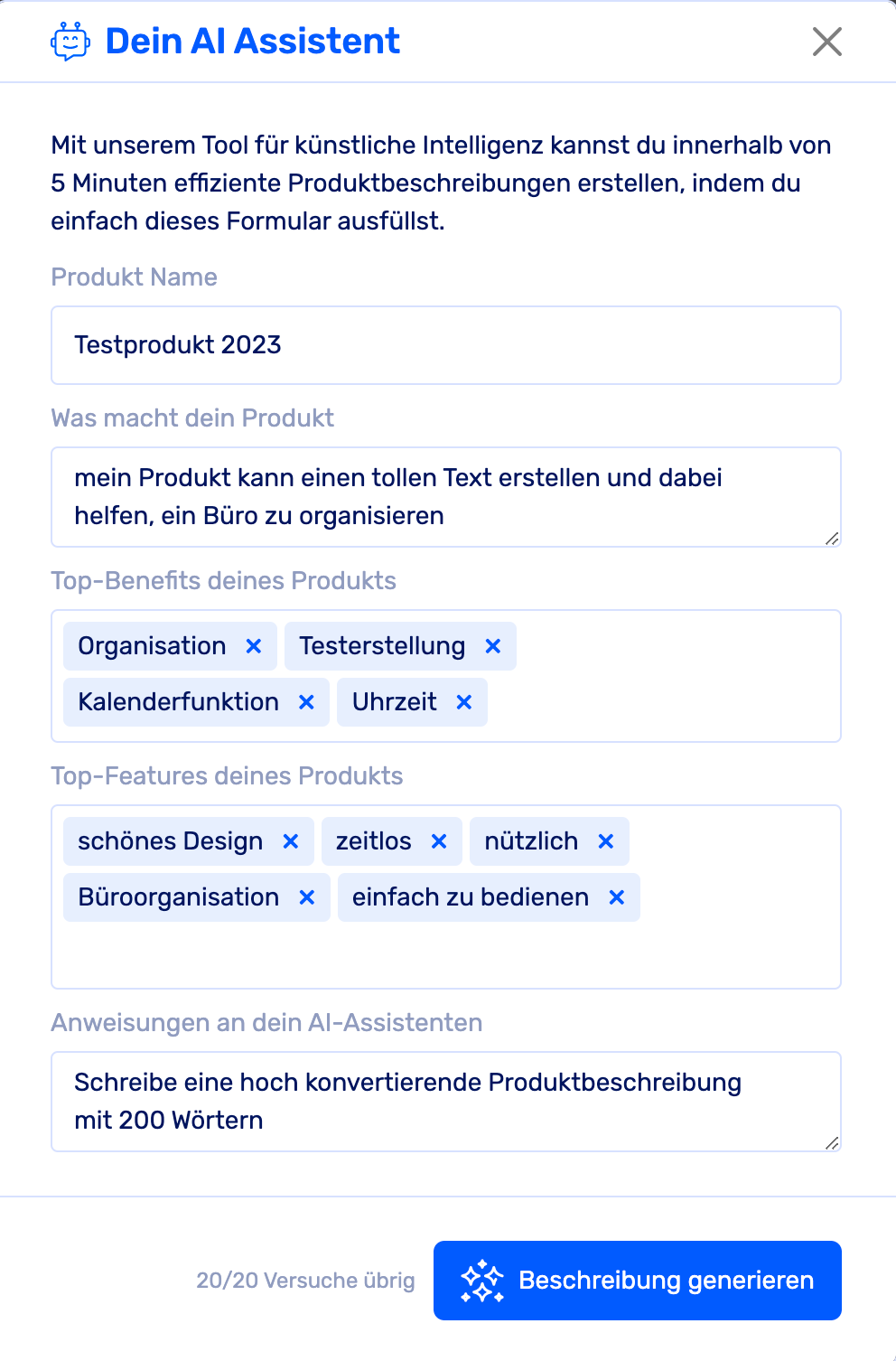 Es öffnet sich ein neues Fenster, der AI Assistent. Hier kannst du dein Produkt mit ein paar Stichworten beschreiben (Was macht dein Produkt? Wofür kann es genutzt werden? Was sind die Benefits deines Produkts? etc.).