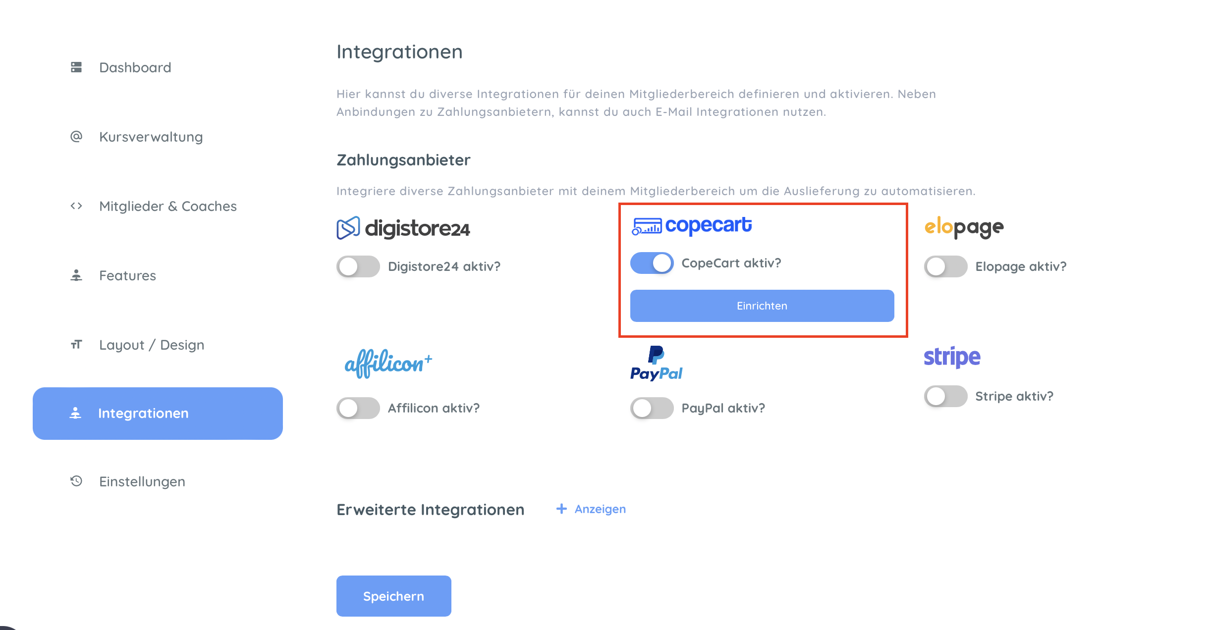 • Wähle CopeCart aus und aktiviere die Integration.