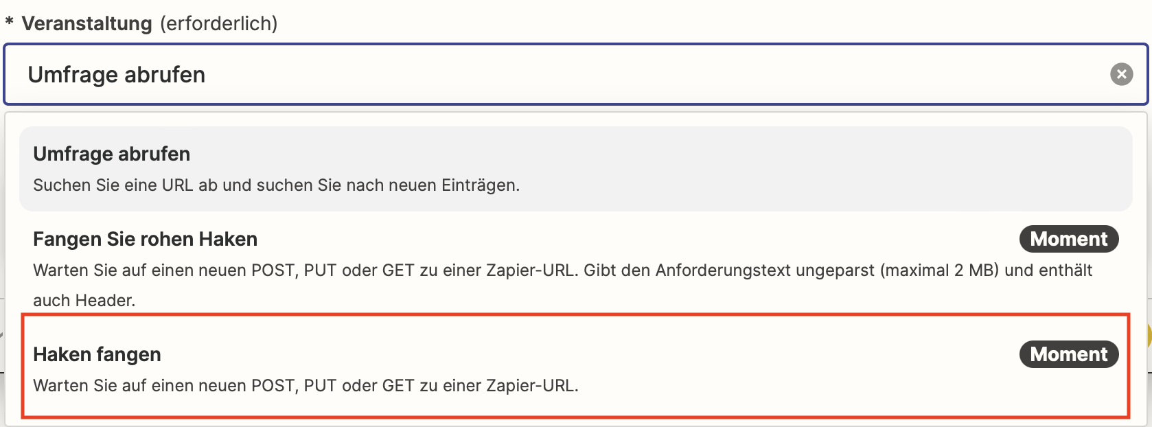 Wähle im nächsten Schritt unter „*Veranstaltung“ die Option „Catch Hook“ (Haken fangen) aus.
