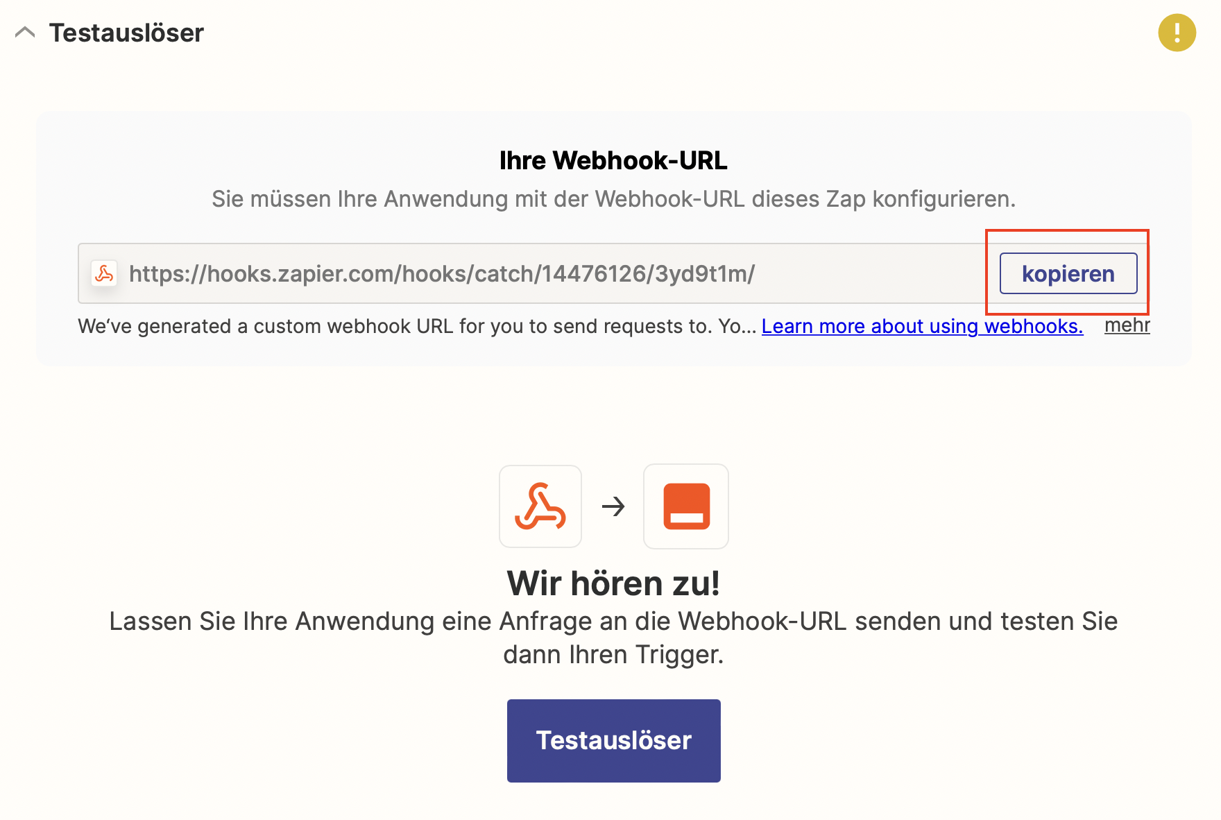 Du bist jetzt beim Schritt „Test this step“ (Testauslöser) angelangt. Kopiere nun die angezeigte Webhook URL, die du für den nächsten Schritt brauchen wirst.