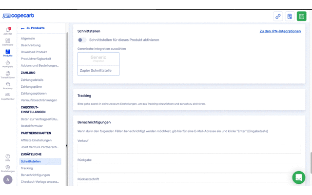 Als Nächstes musst du eine IPN-Verbindung zwischen Zapier und CopeCart konfigurieren, sodass CopeCart jedes Mal, wenn das Produkt gekauft wird, eine Benachrichtigung an den Webhook-Endpoint sendet.