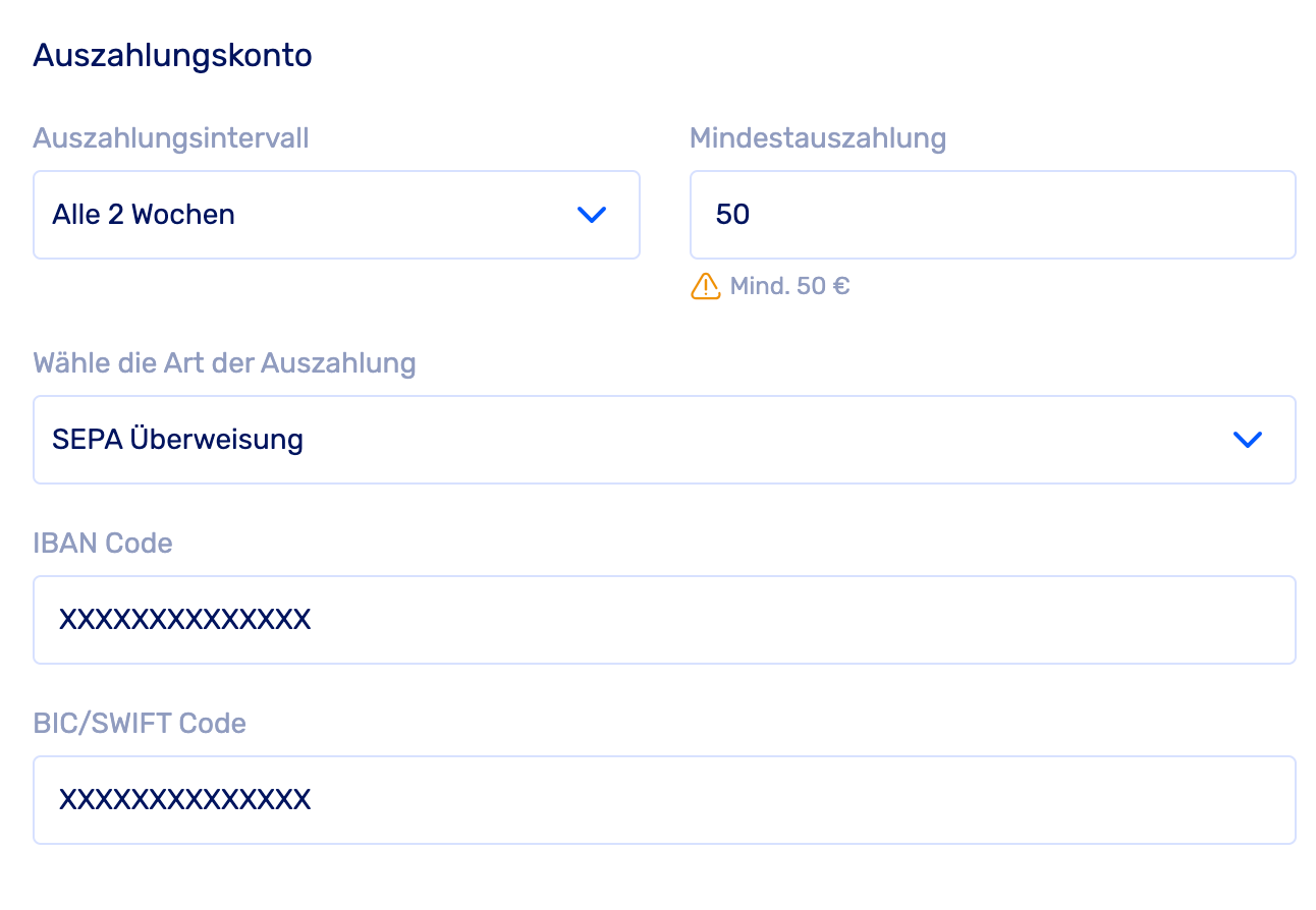 Unter Einstellungen -> Account Einstellungen -> Auszahlungskonto kannst du deinen Auszahlungsintervall, den Mindestauszahlungsbetrag sowie IBAN und BIC für dein Konto einrichten.