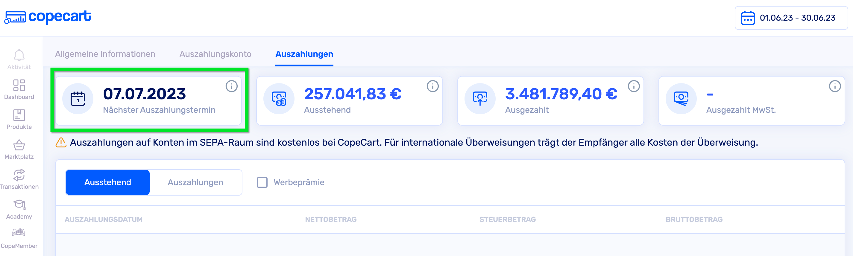 Den nächsten Auszahlungstermin siehst du unter dem Reiter Auszahlungen in deinem CopeCart-Account.