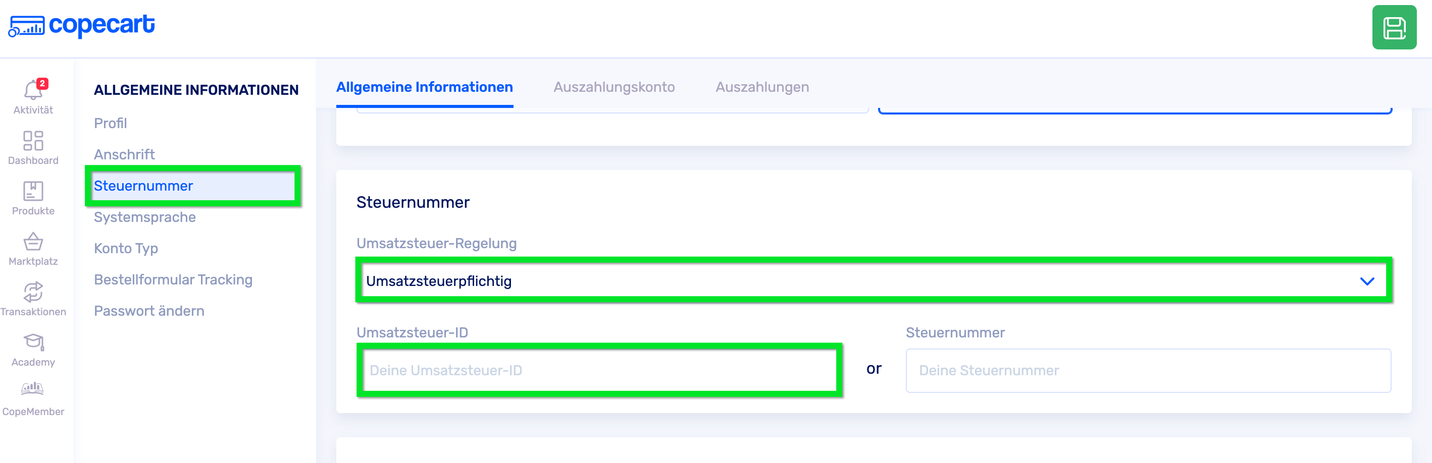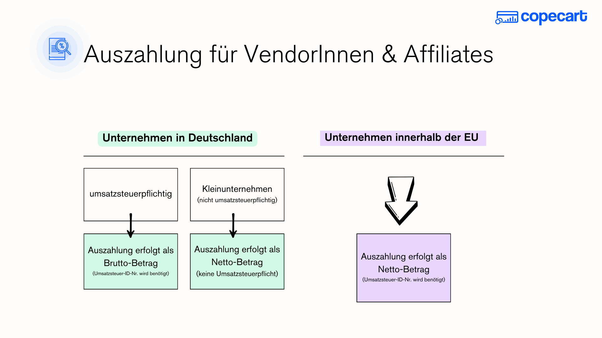CopeCart berechnet die Umsatzsteuer bei jedem Verkauf entsprechend der geltenden Regeln. Bist du Kleinunternehmer oder umsatzsteuerpflichtig? Deine gewählte Regelung beeinflusst, ob du Brutto- oder Nettobeträge erhältst. Als umsatzsteuerpflichtiges Unternehmen aus Deutschland erhältst du deine Auszahlung als Bruttobetrag und bist selbst für die Abführung der Mehrwertsteuer verantwortlich.