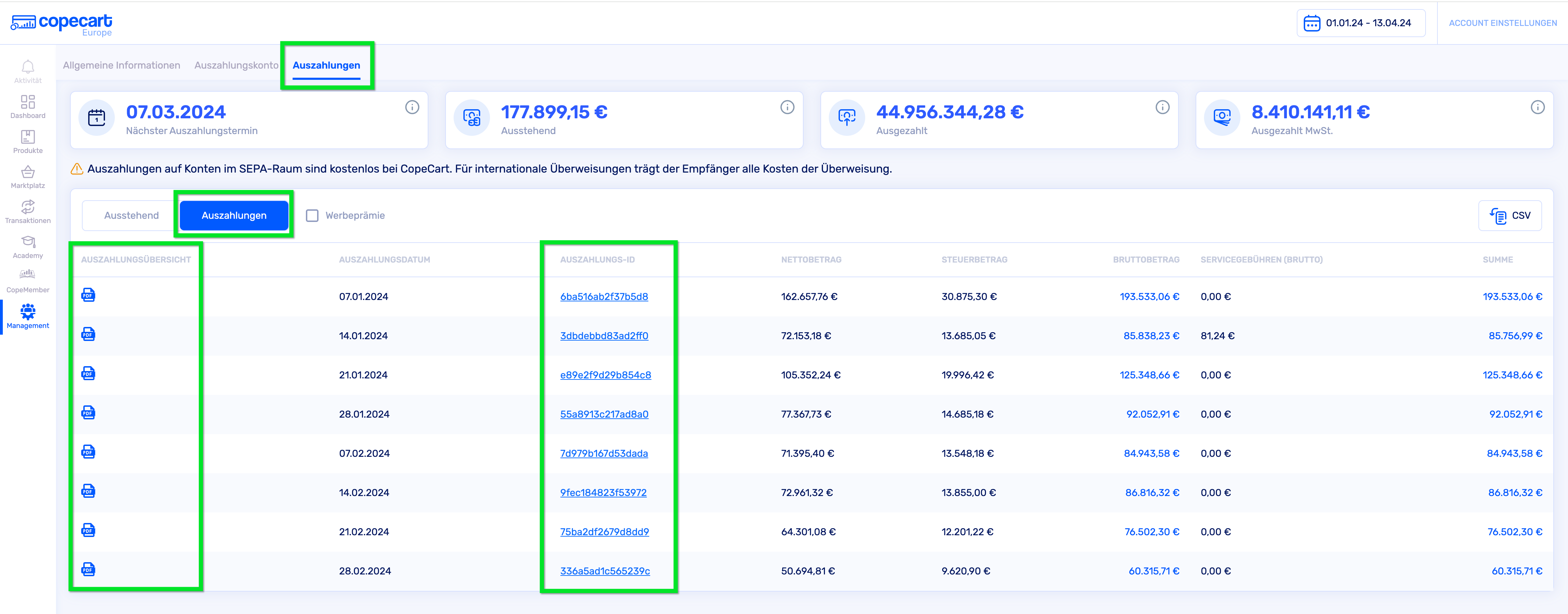 Unter Auszahlungen erhältst du einen Überblick über alle bereits erfolgten Auszahlungen. Jede Transaktion wird hier mit einer ID und den jeweiligen Bestell-IDs angezeigt.