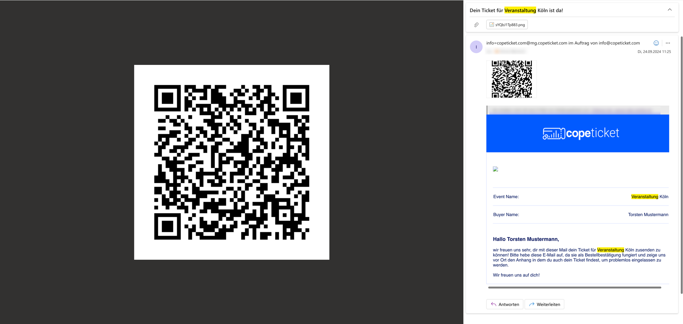 Ticket als QR-Code: Dieser QR-Code dient als digitale Eintrittskarte und kann direkt mit der CopeTicket-App gescannt werden.