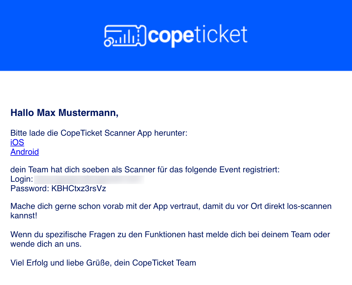 Nach Abschluss erhält der Scanner eine Einladungsmail, die alle notwendigen Informationen enthält, um sich einzuloggen und die Tickets mit der CopeTicket-App zu scannen: