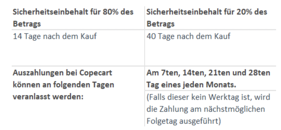 Die verbleibenden 20 % werden aus Sicherheitsgründen 40 Tage nach der Bestellung überwiesen. Dadurch stellt CopeCart sicher, dass eventuelle Rücklastschriften oder Rückgaben bereits berücksichtigt wurden, bevor die restliche Zahlung erfolgt.