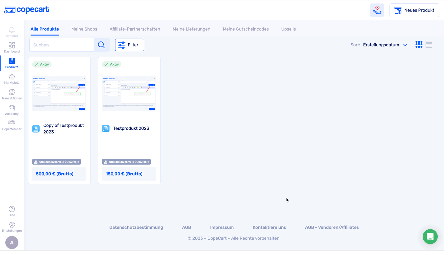 Um eine Datei zu deinem e-Book-Produkt in CopeCart hinzuzufügen, erstelle ein neues E-Book-Produkt oder öffne in deinem bestehenden Produkt den Bearbeitungsmodus und fahre mit dem Abschnitt 'Download Produkt' fort.