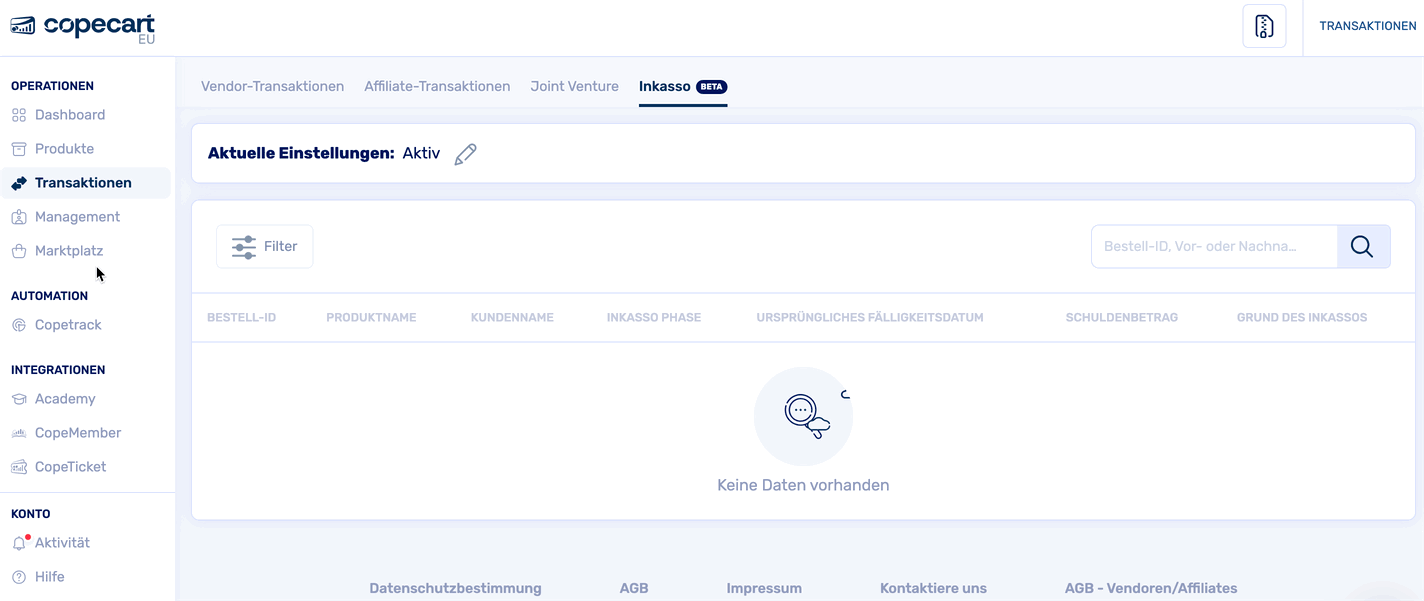 Der Inkasso-Bereich in deinem CopeCart-Account