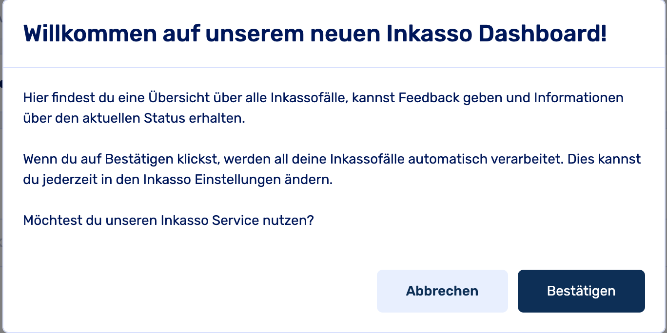 Auf dieser Seite findest du ein Pop-up, in dem du deine Inkasso-Einstellungen überprüfen, ggf. aktualisieren und anschließend bestätigen kannst.