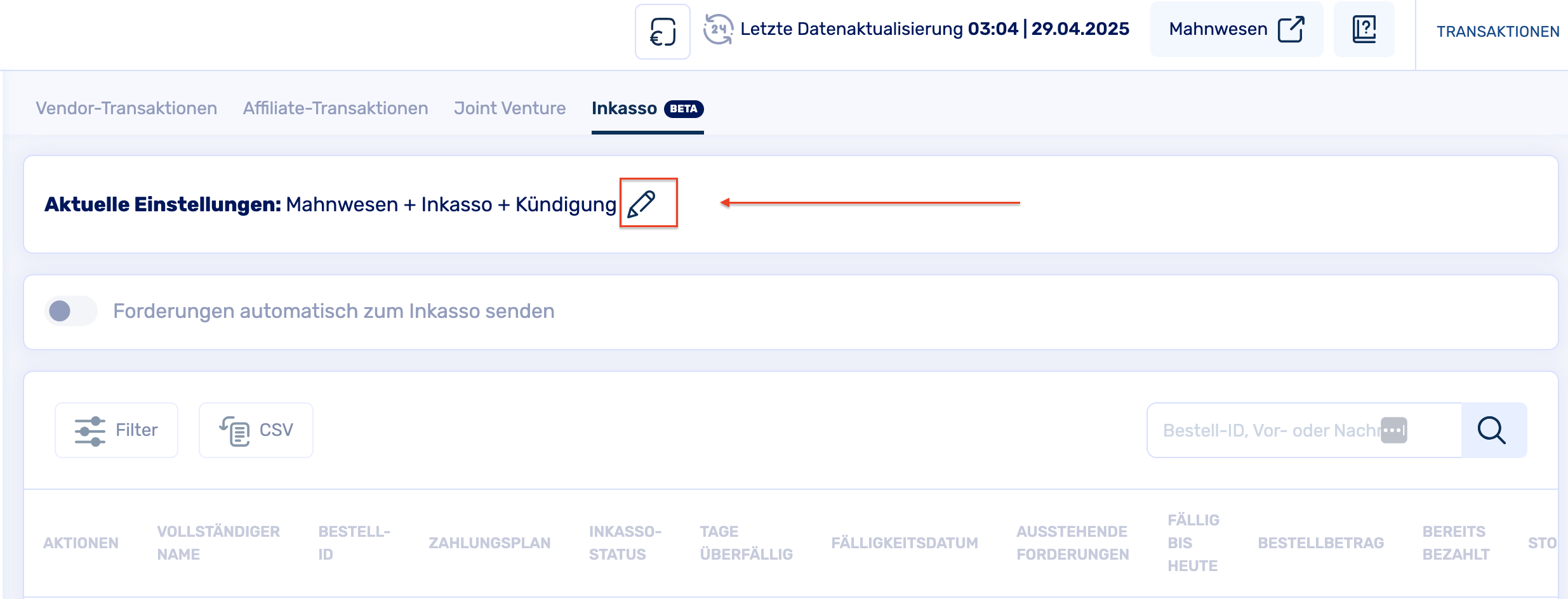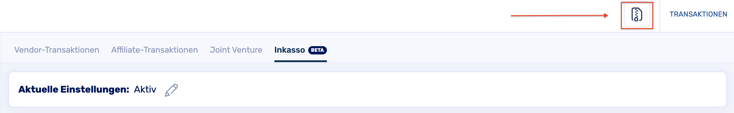 Gehe in deinem Account auf die Kategorie "Transaktionen" und wähle dann oben rechts im Menü die Rubrik "Inkasso (Beta)"
