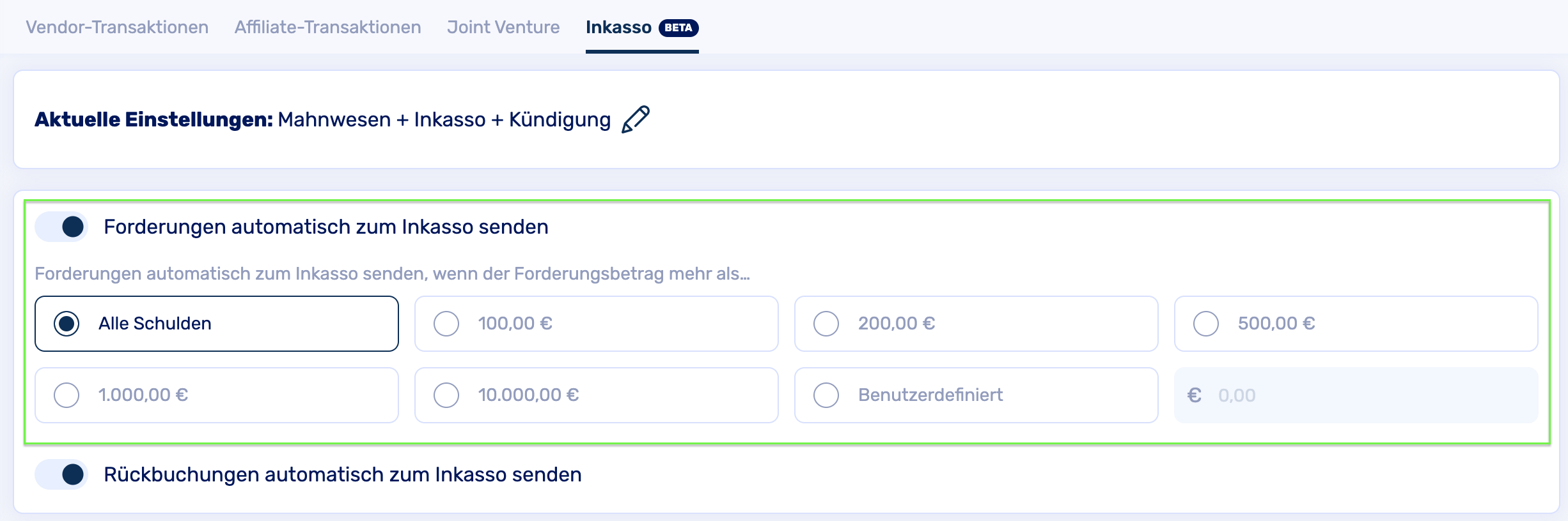 Hier kannst du festlegen, ob Rückbuchungen – also Fälle, in denen Zahlungen vom Kunden zurückgezogen wurden – automatisch an das Inkasso übergeben werden sollen.
