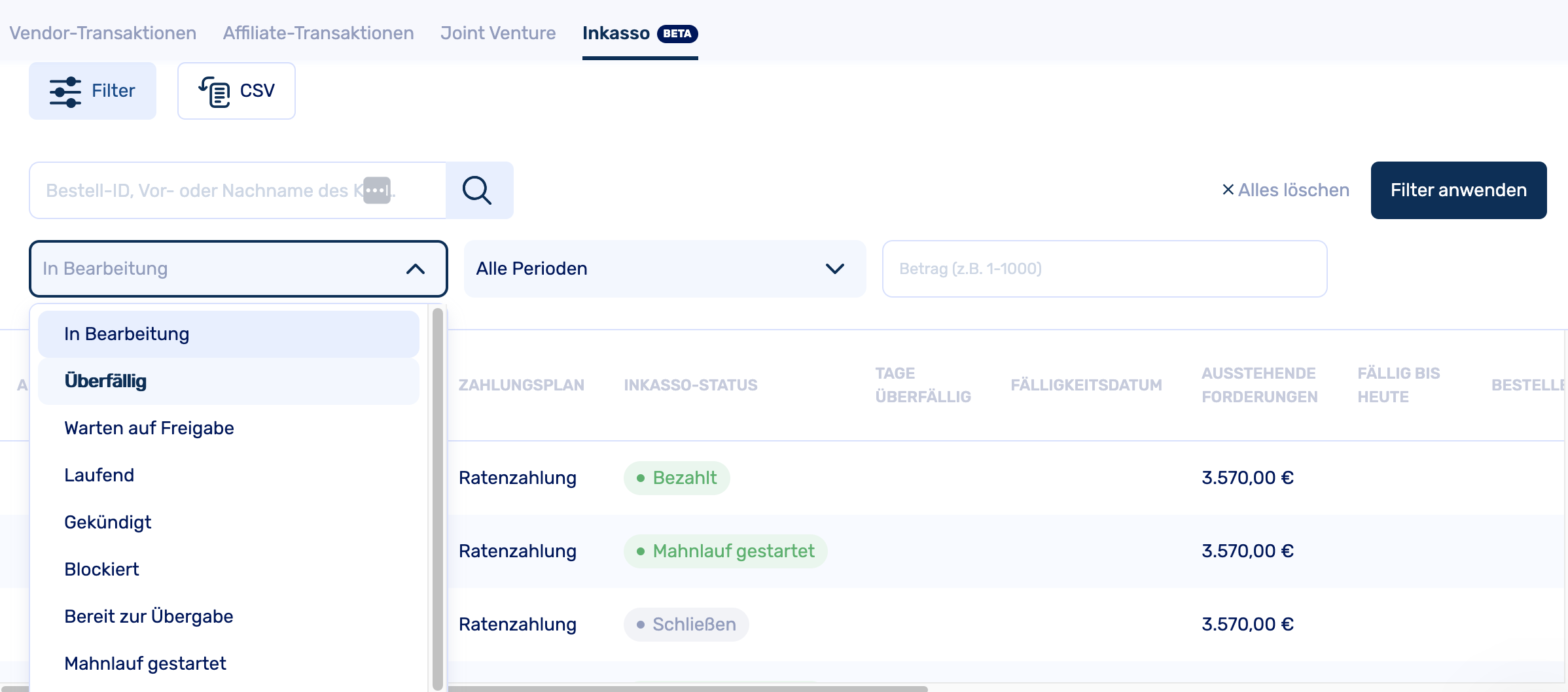 Im Feld „Betrag“ kannst du die Forderungssumme eintragen, nach der du filtern möchtest. Zudem hast du die Möglichkeit, nach Bestell-ID sowie dem Vor- oder Nachnamen der Kundin bzw. des Kunden zu filtern. So behältst du stets den Überblick über deine Fälle.