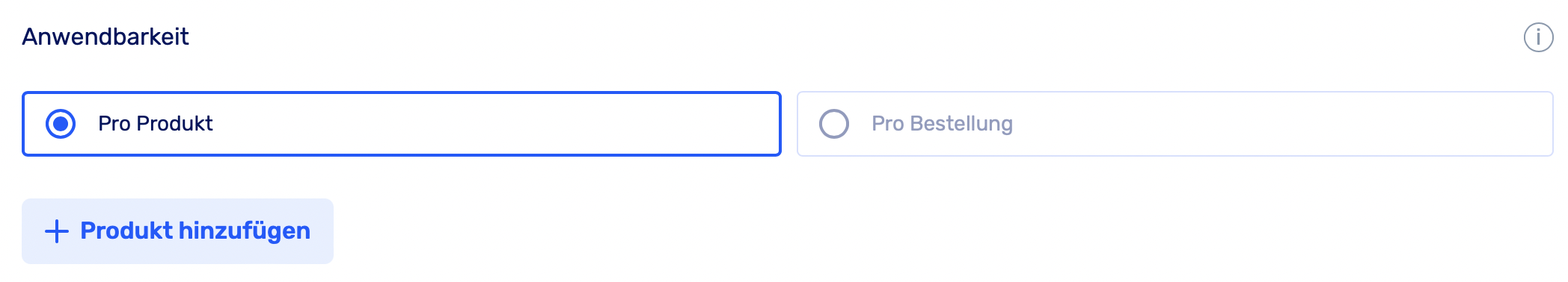 Die Anwendbarkeit pro Produkt ermöglicht es den Kundinnen und Kunden, ein bestimmtes Produkt mit einem Rabatt zu kaufen, ohne die Preise der anderen Produkte in der Bestellung zu beeinflussen. Du wählst das entsprechende Produkt oder auch mehrere Produkte aus, indem du auf den Button "Produkt hinzufügen" klickst.