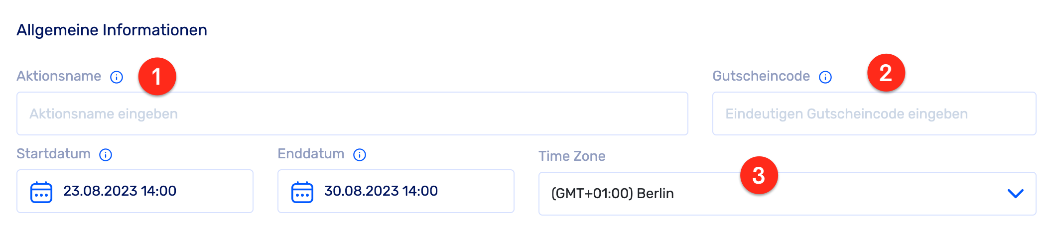Startdatum/ Enddatum/ Time Zone: Hier legst du die Gültigkeitsdauer des Gutscheincodes fest. Du kannst das aktuelle Datum und die aktuelle Uhrzeit als Startzeitpunkt verwenden oder den Gutscheincode für eine zukünftige Nutzung planen. Beachte bitte, dass der Gutscheincode bis zum gewählten Enddatum und der entsprechenden Uhrzeit gültig ist und danach abläuft.