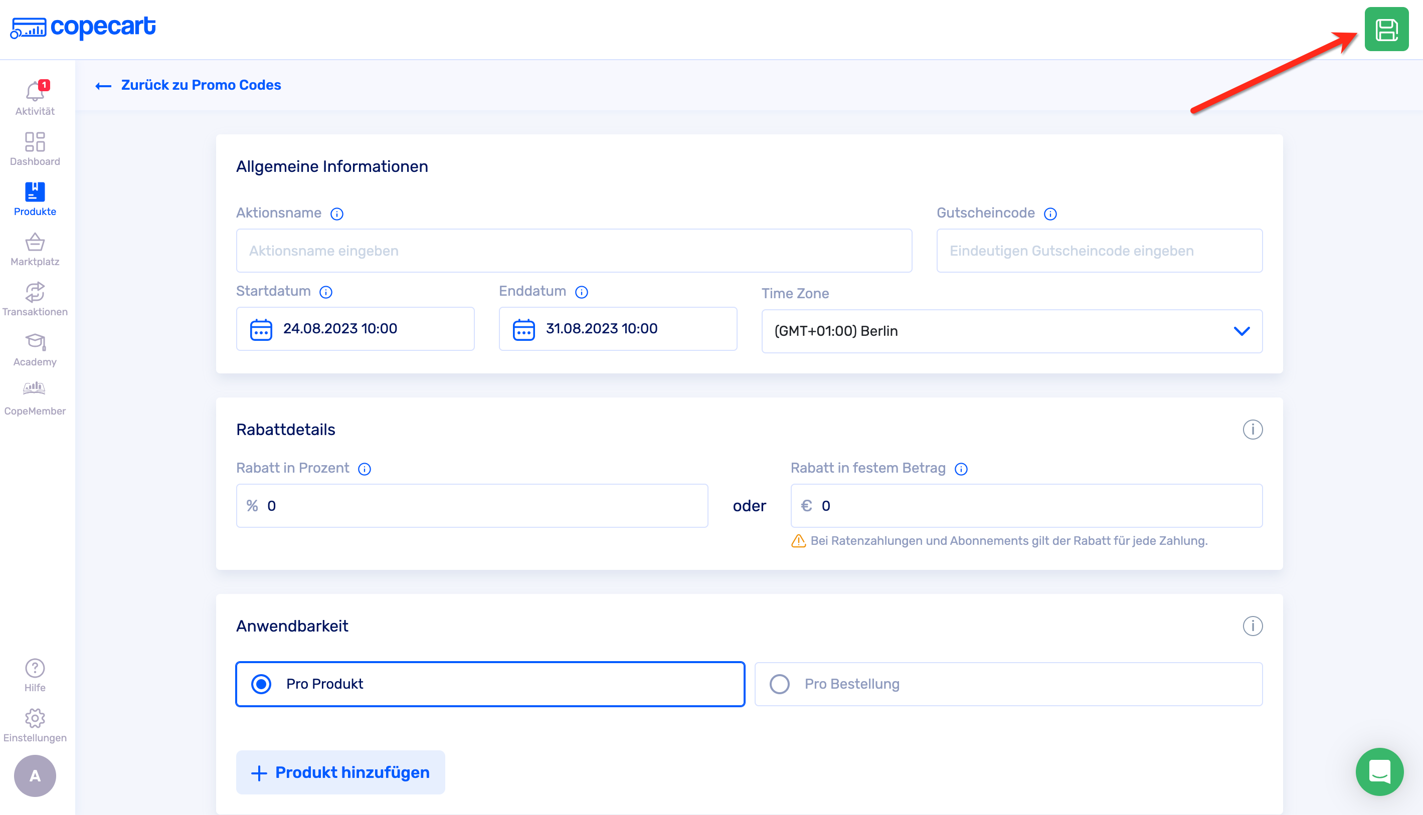Speichere deinen Gutscheincode indem du auf den grünen Speicher-Button klickst.