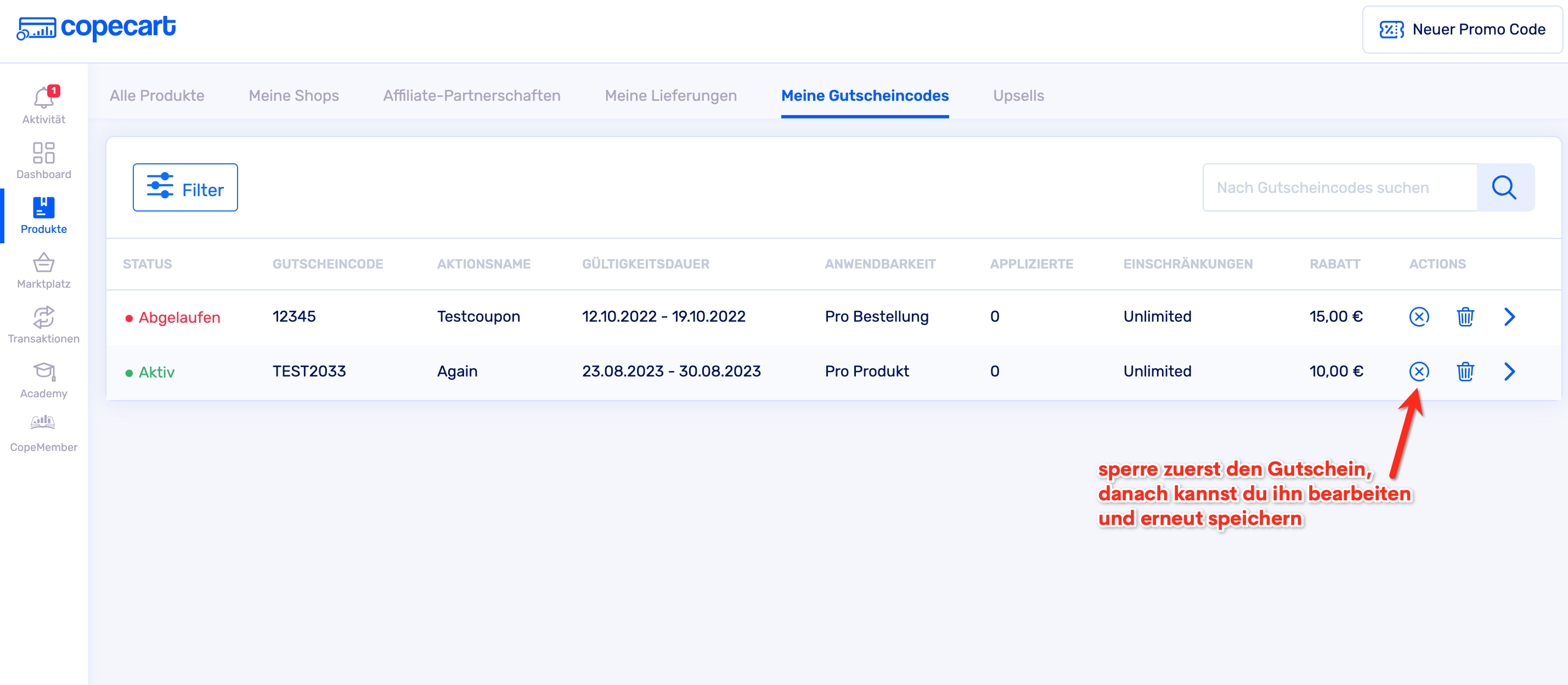 Du kannst auch in der CopeCart-App einen neuen Gutscheincode erstellen, deine älteren Gutscheine einsehen, Gutscheine bearbeiten oder deaktivieren.