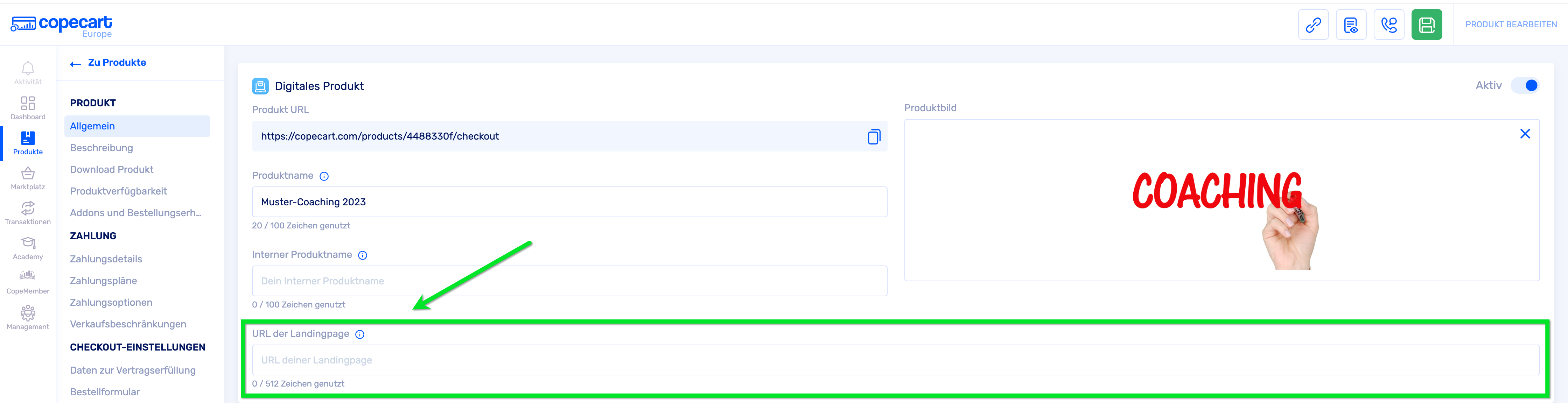 Aktiviere das Kästchen „Gutscheine erlauben“. Speichere auch diese Änderung in deinem Produkt, indem du den grünen Speicher-Button klickst.
