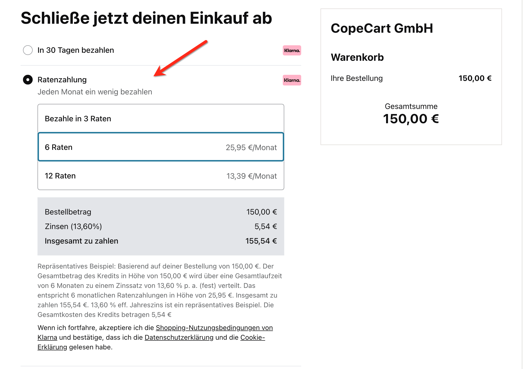 mit Zinsen sind bis zu 36 Raten möglich (die genauen Details dazu legt Klarna fest, CopeCart hat darauf keinen Einfluss)