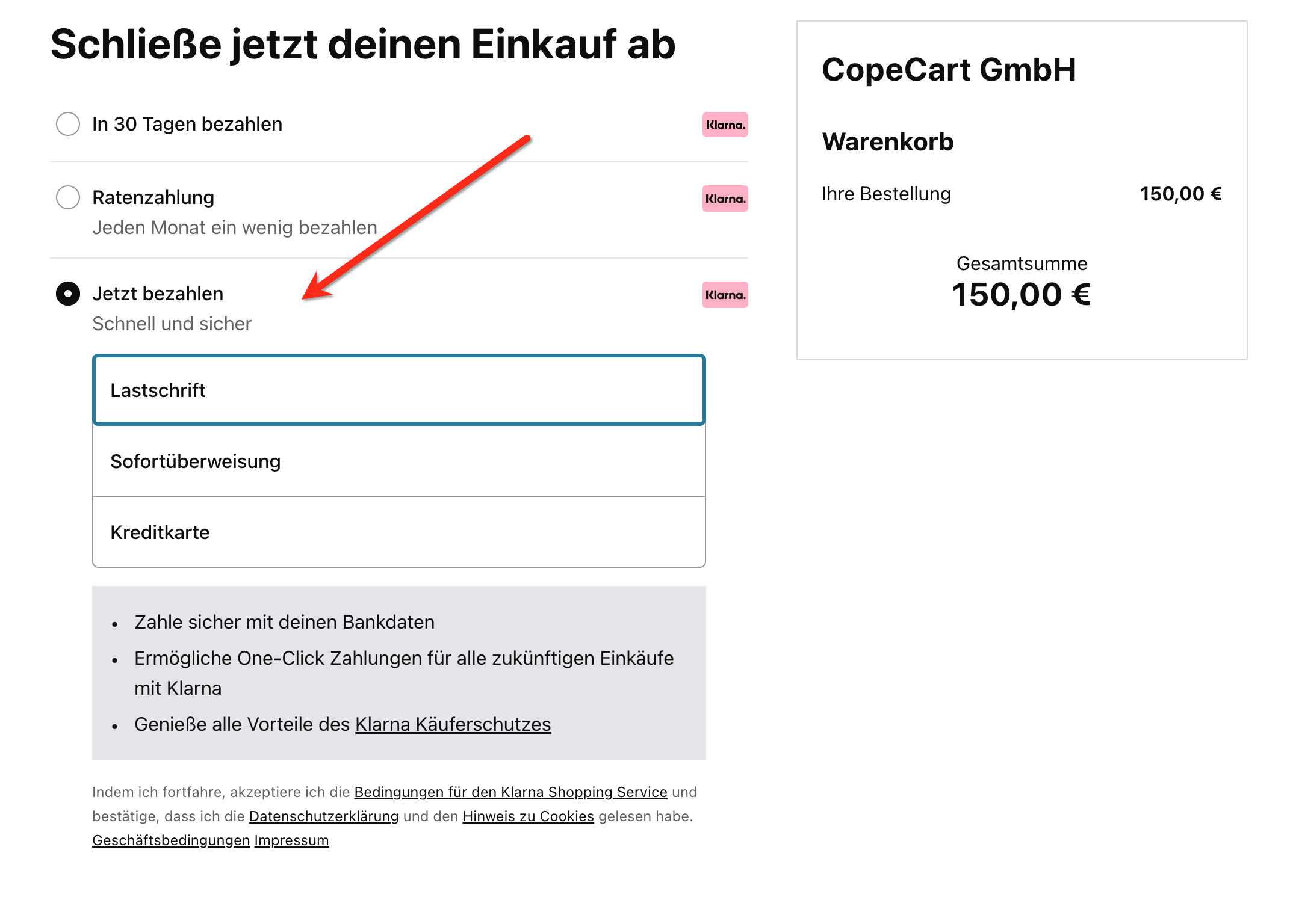 Deinen Kundinnen und Kunden wird beim Checkout dann die Bezahloption "Klarna" angezeigt.