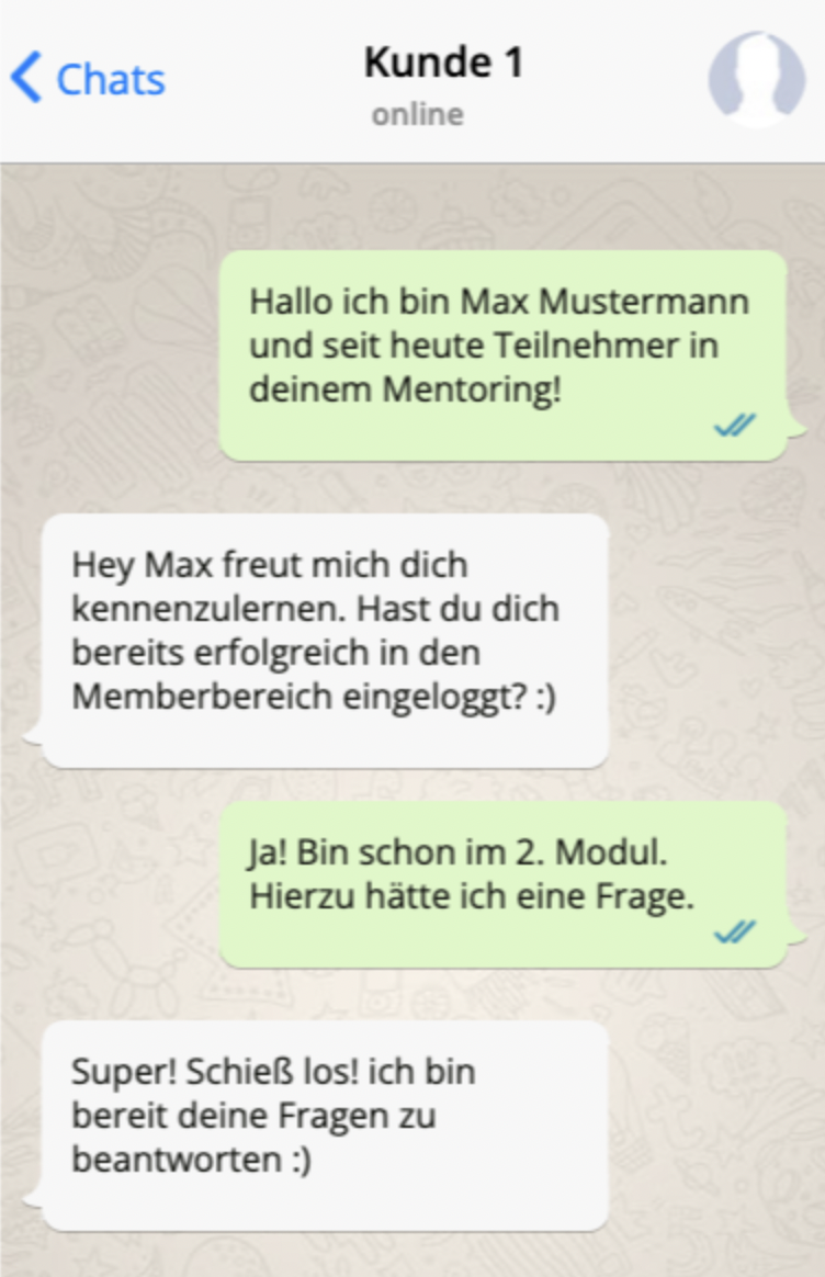 Hiermit sind jegliche Chats und sonstiger Austausch zwischen dir als ProduktherstellerIn und der Kundin/ dem Kunden gemeint. Es muss klar erkennbar sein, dass es eine Konversation zwischen dir und deiner Kundin/ deinem Kunden ist.