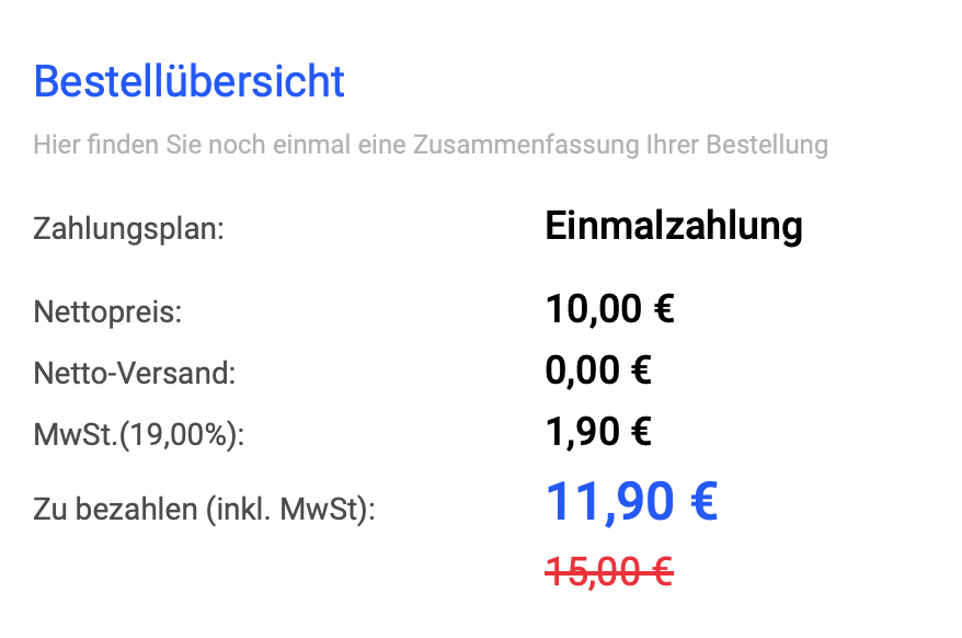 Bitte beachte, dass der reduzierte Produktpreis derzeit nicht bei einer 1-Step Checkout-Seite angezeigt werden kann. Um den reduzierten Preis anzuzeigen, empfehlen wir die Konfiguration eines 2-Step-Checkouts.