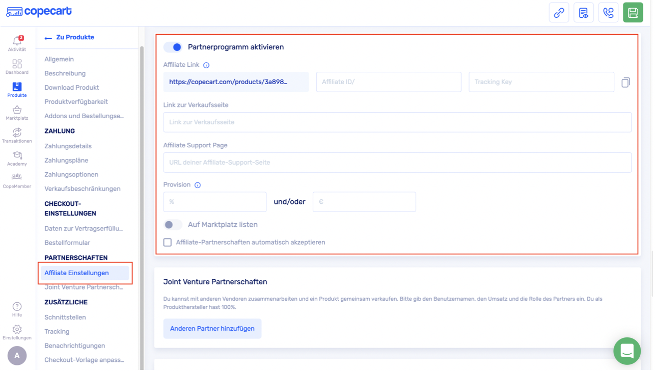 Beachte, dass du für selbst erstellte Produkte keine Affiliate-Provisionen erhalten kannst. Du kannst nicht gleichzeitig Vendor und Affiliate derselben Produkte sein.