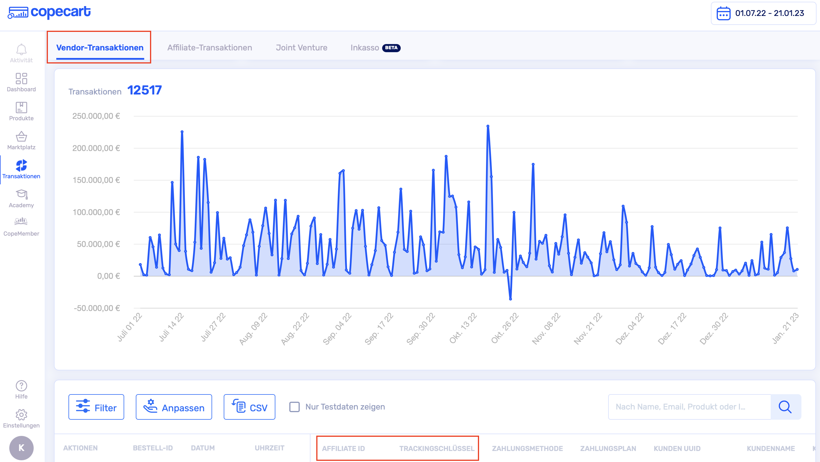 Um die Verkäufe mit den Trackingschlüsseln zu verfolgen, geh auf die Registerkarte „Transaktionen“ und scrolle nach unten zur Transaktionsliste. Hier kannst du alle Datensätze finden und sie analysieren.