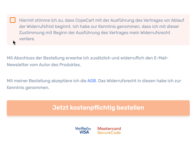 Beim Kauf von Produkten über CopeCart steht Ihnen als Käuferin/ Käufer grundsätzlich ein Widerrufsrecht zu. Das bedeutet, dass Sie das Recht haben, innerhalb einer bestimmten Frist ohne Angabe von Gründen von Ihrem Kaufvertrag zurückzutreten, sofern Sie während des Kaufprozesses nicht auf Ihr Widerrufsrecht verzichtet haben.