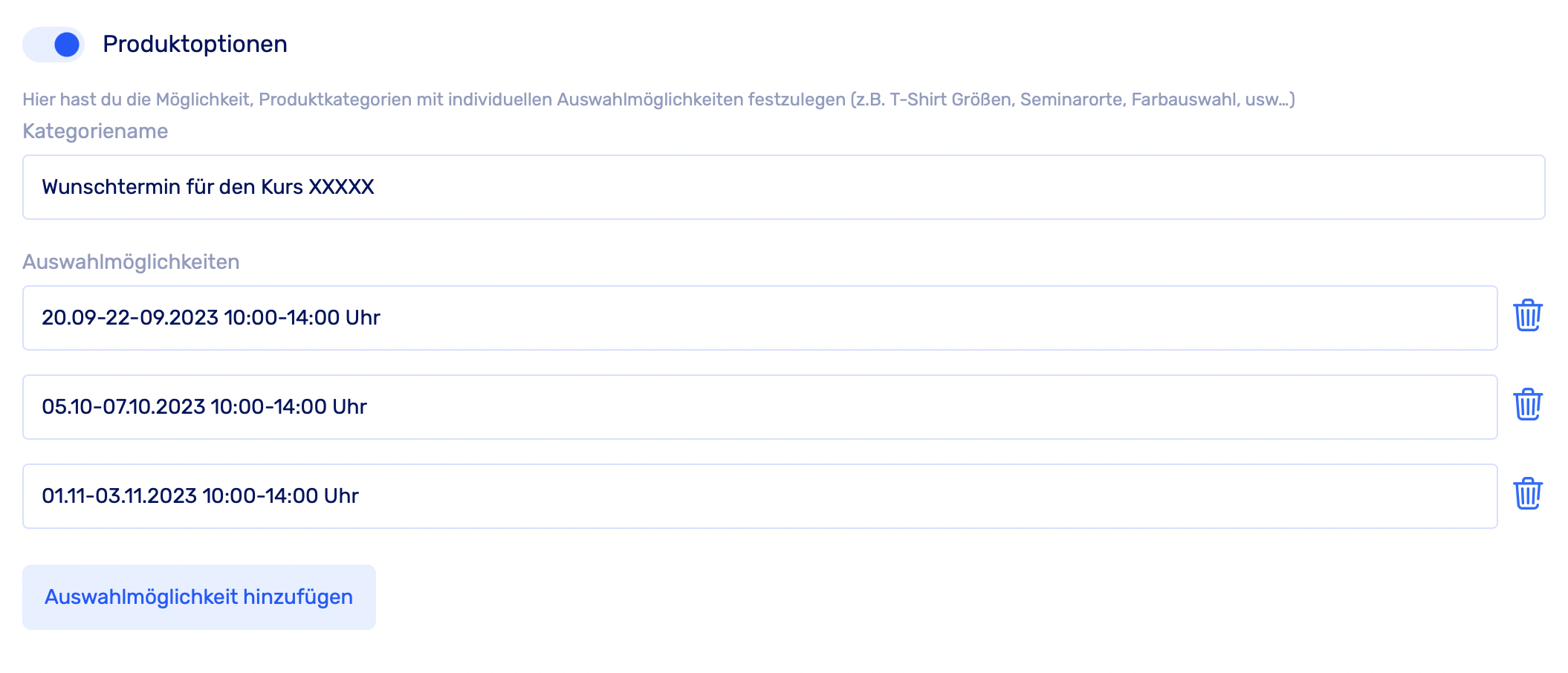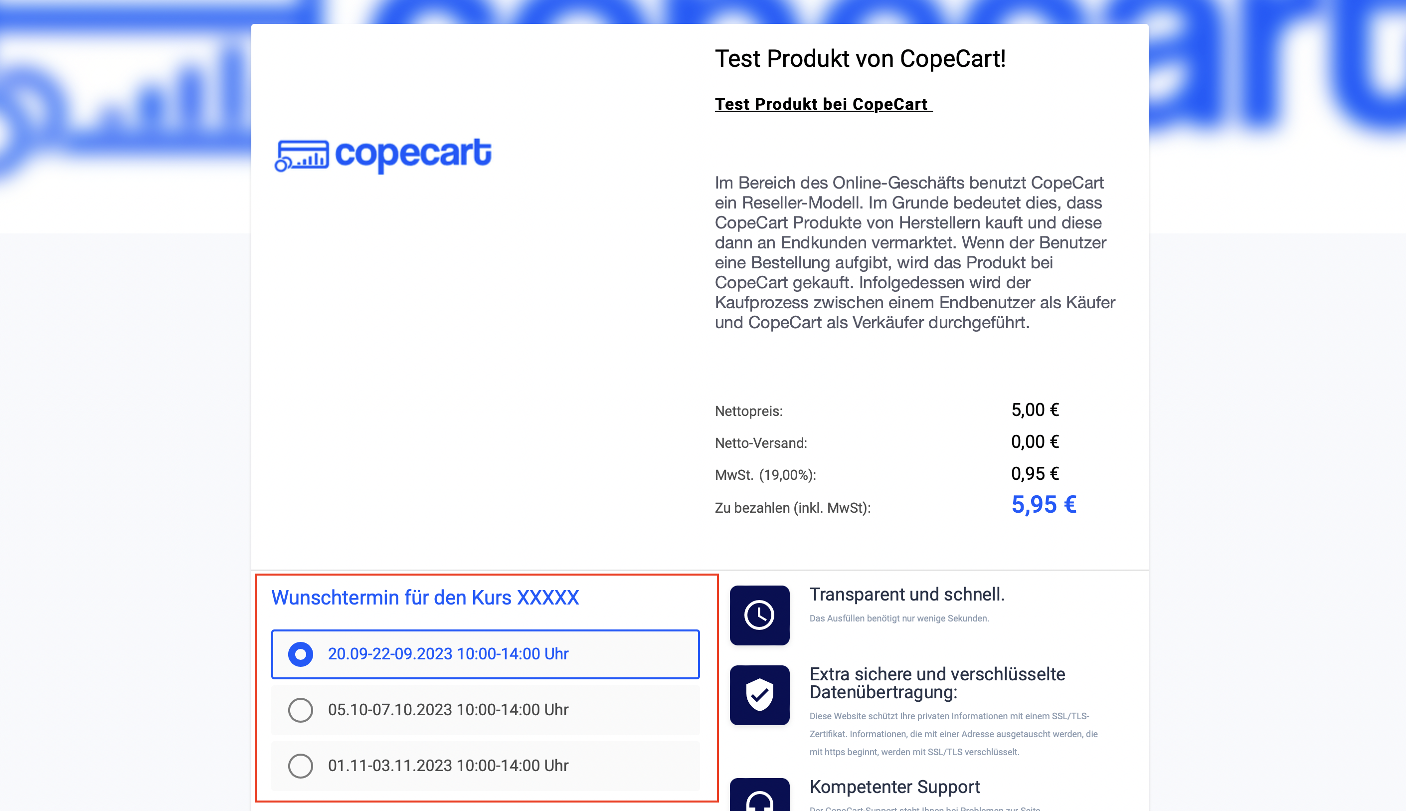Beispiel: Du verkaufst über CopeCart Kurse. Über die Produktoption hast du die Möglichkeit, die verschiedenen Veranstaltungstage und Zeiträume zu hinterlegen, sodass deine Kunden auf deiner Checkout Seite den Tag frei wählen können.